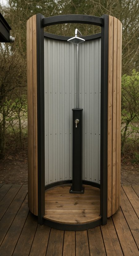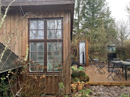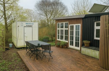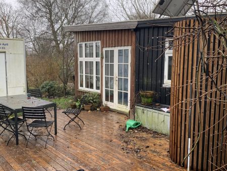 Fra terrassen kan du også nyde en af kolonihavens små luksusoplevelser: den lækre udebruser med varmt vand. Den giver både velvære, sommerhusstemning og en følelse af ferie midt i Åbyhøj – og er noget, alle gæster falder pladask for.