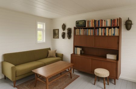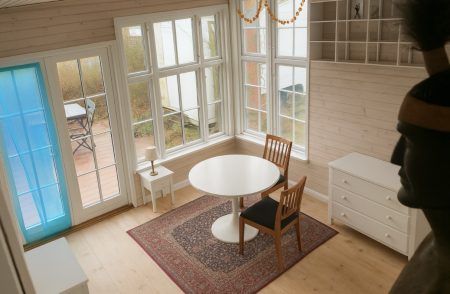 Det øverste rum, hvor brændeovnen står, er hjemmets varme og rolige centrum. Her skaber den knitrende ild en helt særlig atmosfære, som gør rummet oplagt til både forårsweekender, efterårsaftener og stille morgener med kaffe.