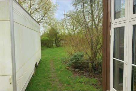 I haven står en 10 m² mandskabsvogn, som i dag rummer både køkken og kloakeret toilet. Der er indlagt strøm i huset og ført strøm frem til vognen, hvilket giver særdeles gode muligheder for dig, der på sigt ønsker at etablere en selvstændig køkken- og badebygning. Her ligger virkelig et stort udviklingspotentiale.